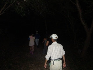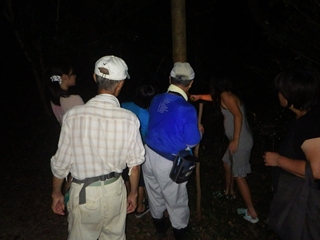余りの暑さに参加者の出足がいま一つ。7時前になってようやく一家族が来場、早速ナイトハイクに出発。