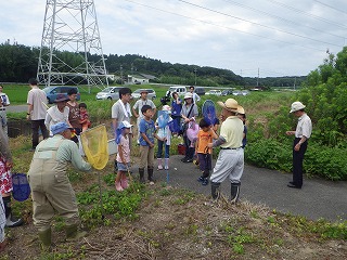 梅雨時独特の蒸し暑い日。ただ、今日は雲が太陽を薄く隠していてくれて助かった。注意事項の後早速川の中へ。初めて入る子が多く、恐る恐る入ったがすぐに慣れてジャバジャバ、水を飛ばして行動。エビ類やコオイムシ、カダヤシなど川の生きものが続々獲れる。「まだやりたーい」の声をよそに、40分ほどで川から上がり、分類しながらパットに移し、さらに一匹一匹を小さいケースに入れて掲げ、その魚・生きものについて説明。(分かち合い)
