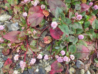 【左】スズメの風景に遭遇。昨今では珍しい…  【右】コンクリート三面張りの川の一部に群生。ヒメツルソバ