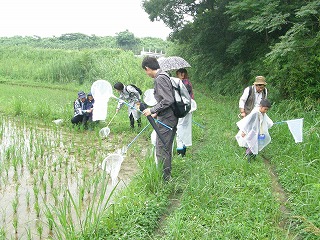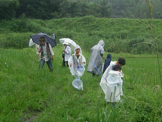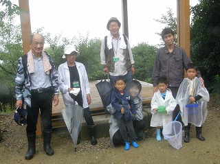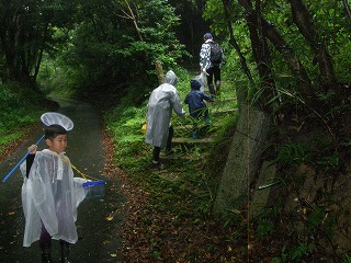 朝から雨、時々小降り、集合場所で参加者2家族が待っていた。9時30分、公民館Pで挨拶、注意事項の説明後、観察場所に車で移動。愛知用沿いに車を止め、小雨の中、田んぼに向かった。一円玉ほどのカエルが足元にいっぱい。まだ、オタマジャクシから孵ったばかりで、まだ尾が残っているカエルもいる。子どもたちは大興奮。バッタもピョンピョン。許可をもらった田んぼ(もち米を作っている)に足を取られそうになった子もいてカッパが役に立っていない。雨でトンボが少ない。貴重なコバノカモメズルなどもみられた。 観察場所から高砂山の頂上へ向かった。案内版があり、歩きやすく整備されていた。途中、キノコを観たり、コクランも多く雨も又良し。頂上は東屋、展望台があり、天気が良ければ セントレアがよく見えるところである。(記・中井三 )