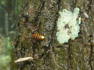 【左】コナラで食事をしているスズメバチとチョウ 【中】老いたクビキリギス 【右】何のアオムシでしょう