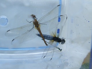 【左】タケトラカミキリ 【中】虫かごに入っていたトンボ 【右】ハラビロトンボ♂