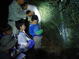この地方も記録的な猛暑が続いている関係か、または、実施日が金曜日の関係か参加者は少なめでした。灯火装置をプールの東側の芝生に設置しました。はじめに公園事務所の挨拶がありました。薄明かりの中、コナラが混じった林にナイトハイクをしました。所どころに樹液が噴出した樹木があり虫の気配があり、カブトムシやコクワガタをゲットすることが出来、家族に渡すことが出来、皆さん満足をしていました。