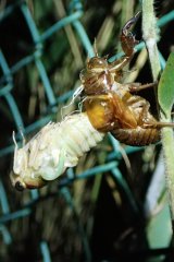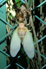 【左】アブラゼミが羽化している    【右】出てきて(左)羽を広げた(右)