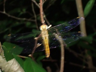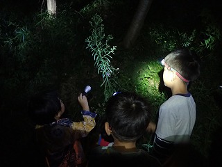 簡単な挨拶の後、多賀神社を一周するコース出かけました。森の中は昆虫はあまり見ることが出来ませんでしたがキノコを見つけることが出来ました。森を出て虫の音を聞きました。アオマツムシの大きな音の中でマツムシ、スズムシ、タイワンクツワムシなどの音を聴くことが出来ました。夜、休んでいるウスバキトンボ、カトリヤンマ、ジャノメチョウなどの仲間を発見し、水路でアメリカザリガニ、ヒバカリ、モクズガニを採集しながら灯火装置がある出発点に戻りました。