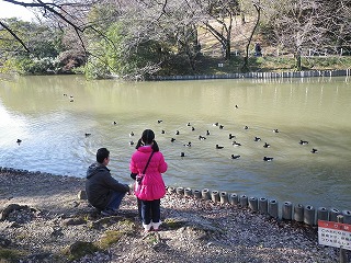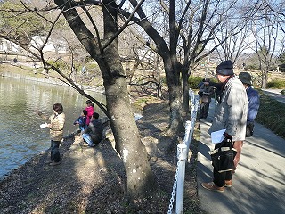 【左】開会挨拶と諸注意 【右】キンクロハジロに餌やり