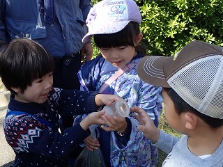 【左】手裏剣(しゅりけん)の材料としてイヌマキを採りました 【右】見てごらん虫が大きく見えるよ