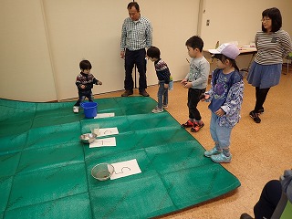 (ゲーム)マテバシイのドングリを離れた入れ物に入れるゲーム ドングリをマツボックリに変えてゲーム マツボックリをイヌマキの葉4枚で作った手裏剣に変えてゲーム