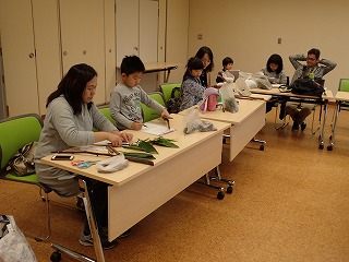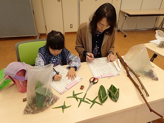 工作の材料を求めて、公園内の樹木、生物を観察しながら移動する。降幡さんがトウネズミモチの葉を巻いて先を少し押さえて笛を作って鳴らしてみせる。親や子どもたちが少しずつ音を出せるようになっていく。マテバシイのドングリを集め、葉を数枚採集する。他にも色々な葉で笛を作って鳴らせることを知り、すごいと思う。マツボックリを拾い集める。タイサンボクの葉を採集。ヤブミョウガ、サザンカ(白)を観察。イヌマキの葉を採集。オオクロバエ、ジョロウグモ、カナヘビ、クロウリハムシ、クロヤマアリ、モリチャバネゴキブリなど観察。公園内の観察を終えて、センターへ戻る。工作やゲームを体験する。