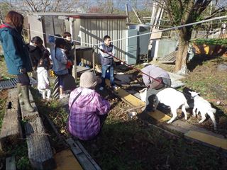 【左】挨拶の後、ヤギの爪切りの説明 【右】林の中。竹ブランコで遊ぶ(お尻の棒も竹)