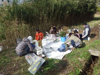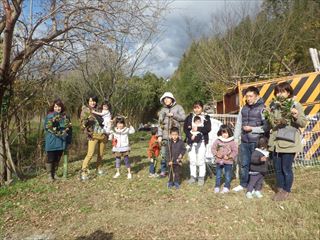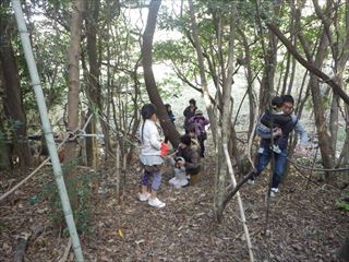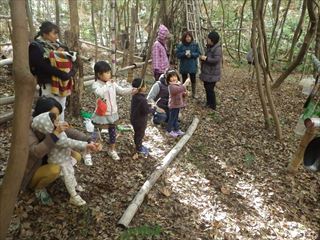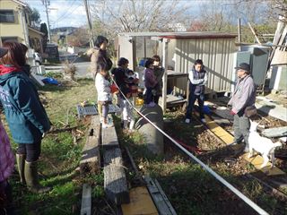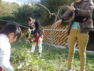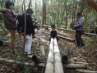 開始時間を少し過ぎたころから一般参加者が2組来て、ヤギと戯れてから竹林へ入って遊びました。 未就学児童だけでしたが、ブランコやターザンロープなどを楽しんでいました。竹林で遊びすぎたのか、作る時間が足りなくなって12時までかかってしまいました。
