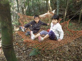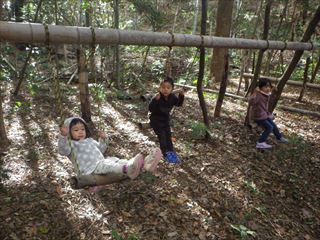 【左】林の中へ(探検) 【中】林の中の遊具。シーソー 【右】ハンモック。はかにも遊具は色々あり
