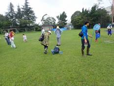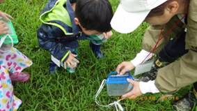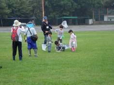 明け方まで雨が降っていたので、昆虫についてはあきらめていたが、なんとグランドにはバッタ、トンボ、コオロギ等が沢山いて、子ども達は大喜びである。特にコクワガタを見つけた時には大歓声。全員が虫籠に色々な虫を入れて満足そうであった。お天気が悪く半分以上欠席となったのに参加された、ご家族だけに熱心に生き物探しをしていた。悪天候のためソフトが中止になったので、思いっきりグランドを駆け回ることができた。また、グラウンドには日頃見られないキノコが色々生えていて観察会としては最高であった。途中知多メディアスの取材があったが、子ども達ははきはきと応じていた。観察会が終わったら雨が降るという恵まれた日となった。(記:吉房)