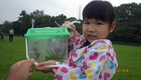 何をとらまえたのかな? 捕えたバッタを虫かごへ