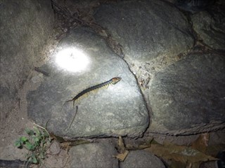 【左】子どもがめざとく虫を捕らえたムカデを発見 【中】カナブンとサトキマダラヒカゲ 【右】集まった虫を説明中