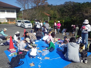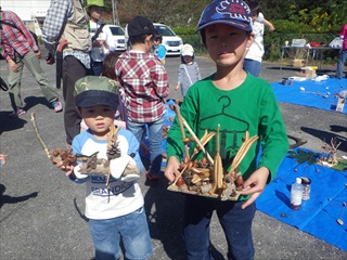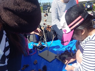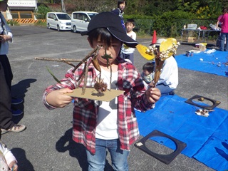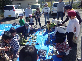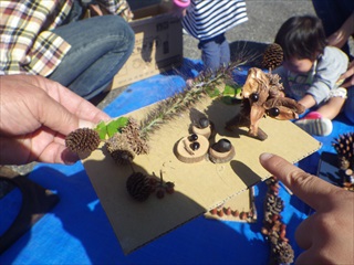 工作材料は、観察会側が用意したドングリ各種、クルミ、松ボックリ、ツバキ、ムクロジ、モミジバフウ等に加え、工作の前に自然公園を散策して集めたツバキの実やヤツデ、アジサイ、モミジなどの葉も加わって、たくさんの種類の材料が揃いました。