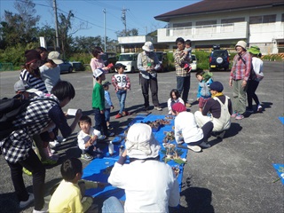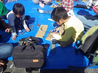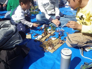 【上の3枚】思い思いに作品を製作。風もなく工作びより。やけどに注意