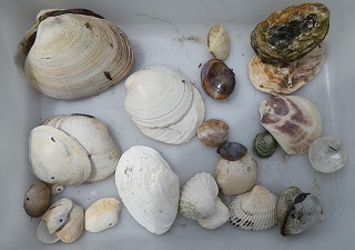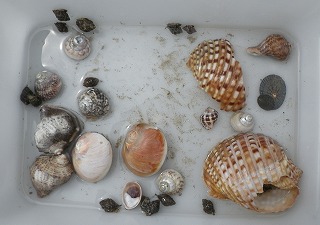 巻き貝(貝殻) : (ツメタガイ) 、(アカニシ)、マツバガイ イボニシ 、(コシダカガンガラ) 、(ボウシュウボラ) 、イシダタミ、(キサゴ)、(シマメノウフネガイ)