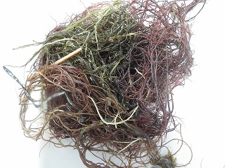 【左】漂着海藻 ミル   【中】漂着海藻 アナアオサ   【右】イタヤガイ(貝殻)