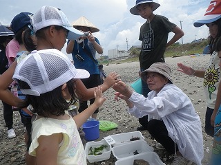 参加者が採集した生きものや貝殻は広げたバットに仕分けてもらい、個々に説明しながら話題の分かち合いをしました。小学生やお母さんから「これなあに」の
