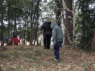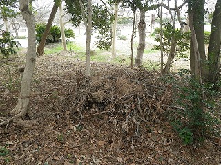 春告鳥(ウグイス)が鳴き、ヒサカキの花が開花する雑木林ですが、間伐や剪定が適度に施されているためか、乾燥した落葉、伐採木、土壌が目立ちます。