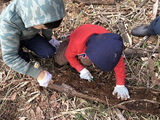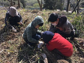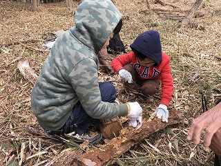 伐採木や枯木の中から湿り気のある朽ち木を選び出し、ドライバーや鉈等を駆使して生きものを掘り出しました。1時間半程で20余種の生きものを探し出しました。