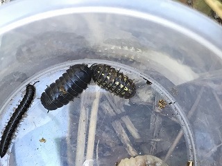 【左】オカダンゴムシ(♂♀)   【中】ヤスデの仲間   【右】カミキリムシ(幼虫)