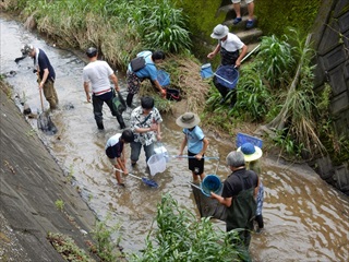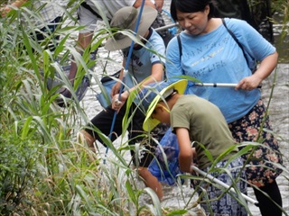 今年は大雨が多かったせいか、深みが更に深く増えているように感じました。資源ごみ回収と重なり開始時間までは駐車場が混んでいました。指導員に採集の仕方を教えてもらいながら、子ども達も次第に捕まえられるようになっていきました。オイカワの群れはいたのに、捕まらなかったのは残念でした。大きなアカミミガメが捕まりましたが、分かち合いをしているうちに逃げて行ってしまいました。