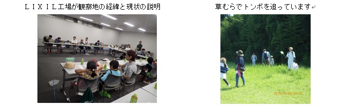 主催者知多市環境政策課からの挨拶、今回の観察地の(株)LIXIL知多工場からは、工場の成り立ちと生産概要とビデオで紹介があり、その後、工場内の森へと観察に入る。森の入口で広がる芝生の広場では群がり飛び交うトンボやバッタをタモで追いかける子供たちの歓声が展開された。