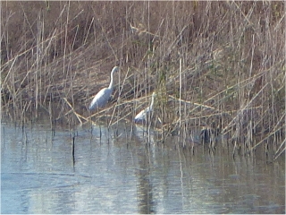 ・チュウサギとコサギが互いに近くに立っていたので大きさの比較ができた(康衛池)
