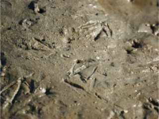 【左】オオバンの足の指    【中】干潟(?) の鳥の足跡    【右】阿久比川。今回、鳥は少なかった