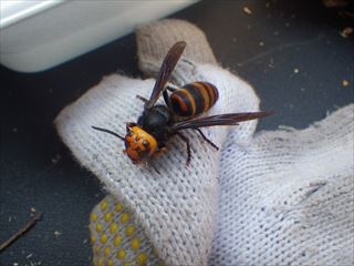 【左】解体作業。練習 【中】冬虫夏草。幼虫の死骸から出るキノコの仲間 【右】コスズメバチ