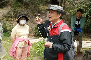 ◎植物:シロツメグサ、カラスノエンドウ、レンゲソウ、オオイヌノフグリ、タチイヌノフグリ、マツバウンラン、タネツケバナ、ナズナ、キュウリグサ、オランダミミナグサ、ツメクサ、キツネノボタン、スミレ、ハハコグサ、オニタビラコ、オオジシバリ、オニノゲシ、ホトケノザ、ヒメオドリコソウ、スズメノヤリ、スズメノカタビラ、スギ(ツクシ)ナ、ヨモギ、セイヨウタンポポ、ムラサキケマン、ギシギシ、ハナニラ、アサツキ、スイバ、イタドリ、アシ、ワラビ、セリ、ゼンマイ、アケビ、クズ、コナラ、カクレミノ、ヤツデ、ヤマハゼ、モウソウチク(外来種)、ヤダケ、ヤマザクラ、コバノミツバツツジ、