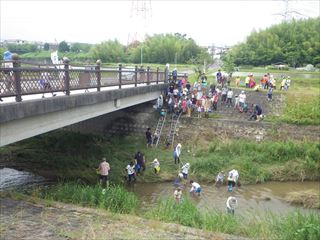 最初に、たもの使い方の説明や諸注意があり、それから、東浦町民俗資料館うのはな館駐車場から歩いて橋に向かいました。川の水はやや濁ってはいるものの、水量もてごろ。感性こそ上がりませんでしたが、川にめがけて親子でそれぞれに突進です。川までに段差があるために梯子を降ります。梯子を使ったことのない子供がほとんどで、恐る恐る梯子を握ります。南川さんの「3点確保」のアドバイスに自信を得て、ずんずん降りていきます。それでも80人近い人数のため、降りるのに時間がかかりました。