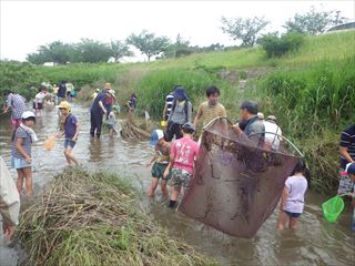 川の隅にたもを構えてがしゃがしゃをします。いたいた、ヤッターと歓声!”エビ゙が取れたよ。” ”魚が入ったよ。”と間をおいて生き物に目がいきます。大人も子供もみんな楽しめました。ハゼやエビがたくさん見つかりました。