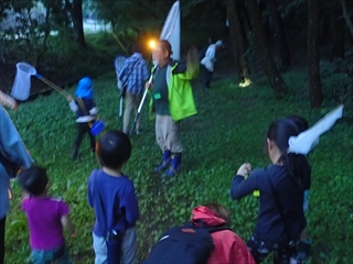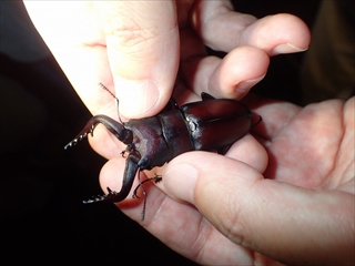 これだけ雨が多いと樹液は出るのか?と思いきやかえって樹液は多く、樹液の発酵する匂いがあちこちでした。かなり湿度は高い。蚊はいつものように人にぶつかるようにして集まってくる。足元はところどころ水たまりで、いつもは見られないキセルガイがさかさまになって木の筋の間に付いていた。木が湿っているので樹液の出ているところを目で追うのは難しい。しかし、暗闇の中でも虫たちのレストランは大盛況。カナブン、ノコギリクワガタ、コクワガタ、カブトムシ。子供たちばかりでなく、お父さん、お母さんたちも童心に帰って歓声が上がる。ノコギリクワガタが年々増えているように思う。雨のせいで、暗闇の中でも見える貝が多く、キノコがたくさん生えていた。