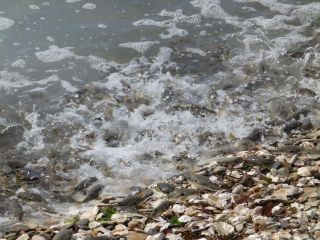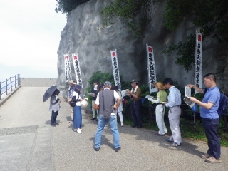 クサフグは波打ち際で体を震わせ、水しぶきを上げながら産卵をします。クサフグの産卵が最盛期を迎えた頃、希望者は堤防の上から静かに波打ち際まで降り、間近で産卵を観察しました。産卵が始まると海水は精子で白濁し、クサフグの警戒心は弱まり、少々近づいても逃げることはありません。