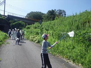 とても暑い日でしたが、ウスバキトンボガ飛び交い、子どもたちはそれを捕まえようと走り回っていました。観察会が進むうちに色々な生き物を発見し、彼らのケースの中はカマキリやツチイナゴ、クズの花などでいっぱいになっていました。