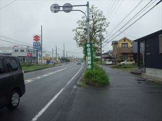 【左】道路に目印の旗。風は無いが雨模様 【右】探検コースへ出発
