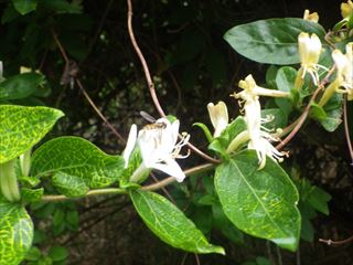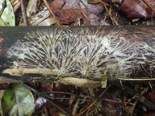 【左】朽ちた竹の表面にできた菌類の模様 【中】スイカズラ 別名-金銀木、忍冬