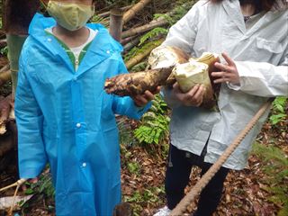 さすがに、ハンモック、ブランコ、シーソー、竹渡り、フジづる登りなどでは遊べなかったが、探検コースは注意しながら小回りコース、大回りコースを実施。そのコース上で"タケノコ"を掘ったりした。