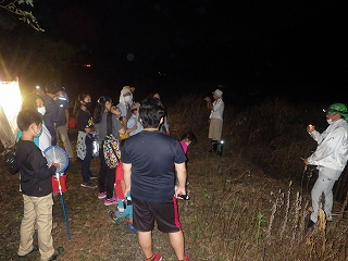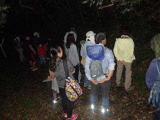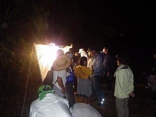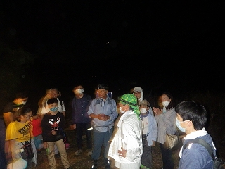 【左】灯火採集場所で始めのあいさつ。この後、ナイトハイク 【右】真っ暗の中でクロマドホタルの光を観察