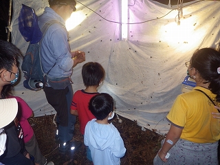 【左】ナイトハイクから戻って、灯火に集まった虫を観察 【右】クロマドホタルを撮る大人たち