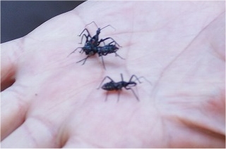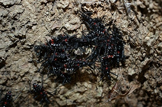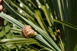 まず、宮池東側を歩きました。大きなエノキの幹でヨコズナサシガメ幼虫の集団を観察。暖かい日差しにナナホシテントウとクビキリギスが姿を現しました。シュロの葉にオオカマキリの卵が2つ。木の幹に人の目玉のような模様を確認しました。