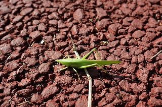【左】シュロの葉裏にオオカマキリの卵(卵のう) 【右】指導員の一人がクビキリギスをつかまえてきた