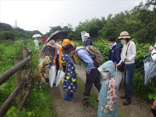 おたまじゃくしからカエルになったばかりの小さなカエルも見られた。雨の中、コナラの樹液か雨の雫かといった幹のぬれているところを探しながらお父さんと子どもが頑張って木を回ってカブトを一ぴきゲット。ナナフシを見つけたお父さんもいて、その珍しさを指導員から聞くと、カブトムシを捕った子がナナフシがぼくもほしいなあと言う視線。でもこれは運ですね。今とれるカブトムシもレアものといわれてちょっと安心。といった、様々な子ども模様?(心境)