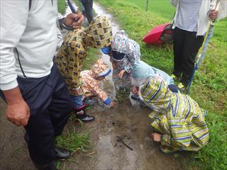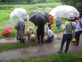 【左】雨は本降りとみなし中止を決定。以後、各自の責任で入場 【右】小さなカエルの観察