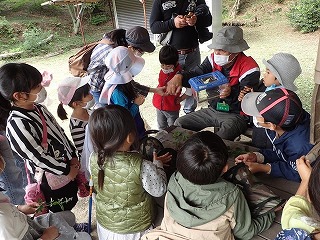 子供たちはイナゴやコオロギ、チョウ、テントウムシなどを手で捕まえたり、たもで捕まえたりして楽しんだ。アケビやヤマノイモのむかごを味わって喜ぶ子もいれば、恐る恐る口に入れる子、躊躇する子といろいろであった。