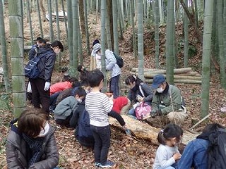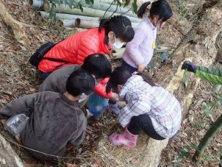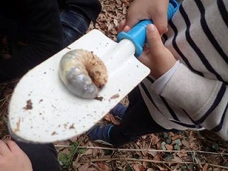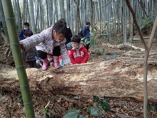 林の中へ入ると、竹藪の竹と競争しながらも立ち枯れ、木が朽ち始めた木の下からはカブトムシの幼虫が何頭も見られた。丸々と太ってしっかりと朽ち木の腐葉土を食べましたといった感じだ。