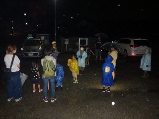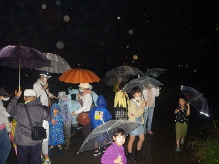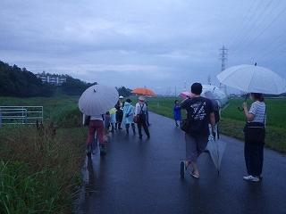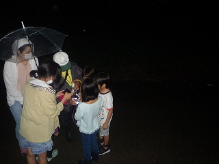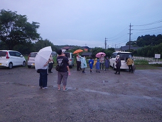 夕方になっても降ったり止んだり。ところが開始直前にピッタリ止んで、終了まで雨無し、ラッキーでした。「ホタルミニ知識」を配り、注意事項を伝えて出発。10分ほど歩いて観察場所へ。道中子供たちは草原でかえるやバッタのこどもを捕らえてご満悦。あっという間に観察場所に到着。